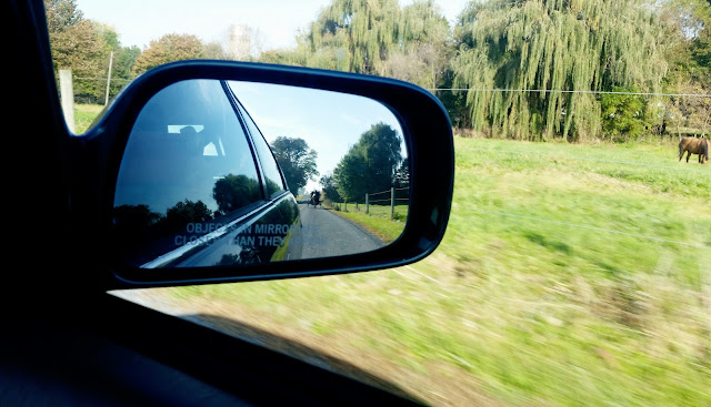 遇到了四匹馬拉著農耕用車,後面三角形牌子是慢車牌,他發現我們在後面時,就揮動著手讓我們超車。
